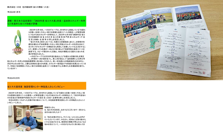 省エネというと一部の部署だけが取り組むものと思われがちですが、一の坊では省エネやサステナビリティに対して「全社員で取り組む文化」が根付いています。「特別な技術がなくても、社員の意識と仕組み次第で環境負荷を減らせる」ことを教えてくれます。