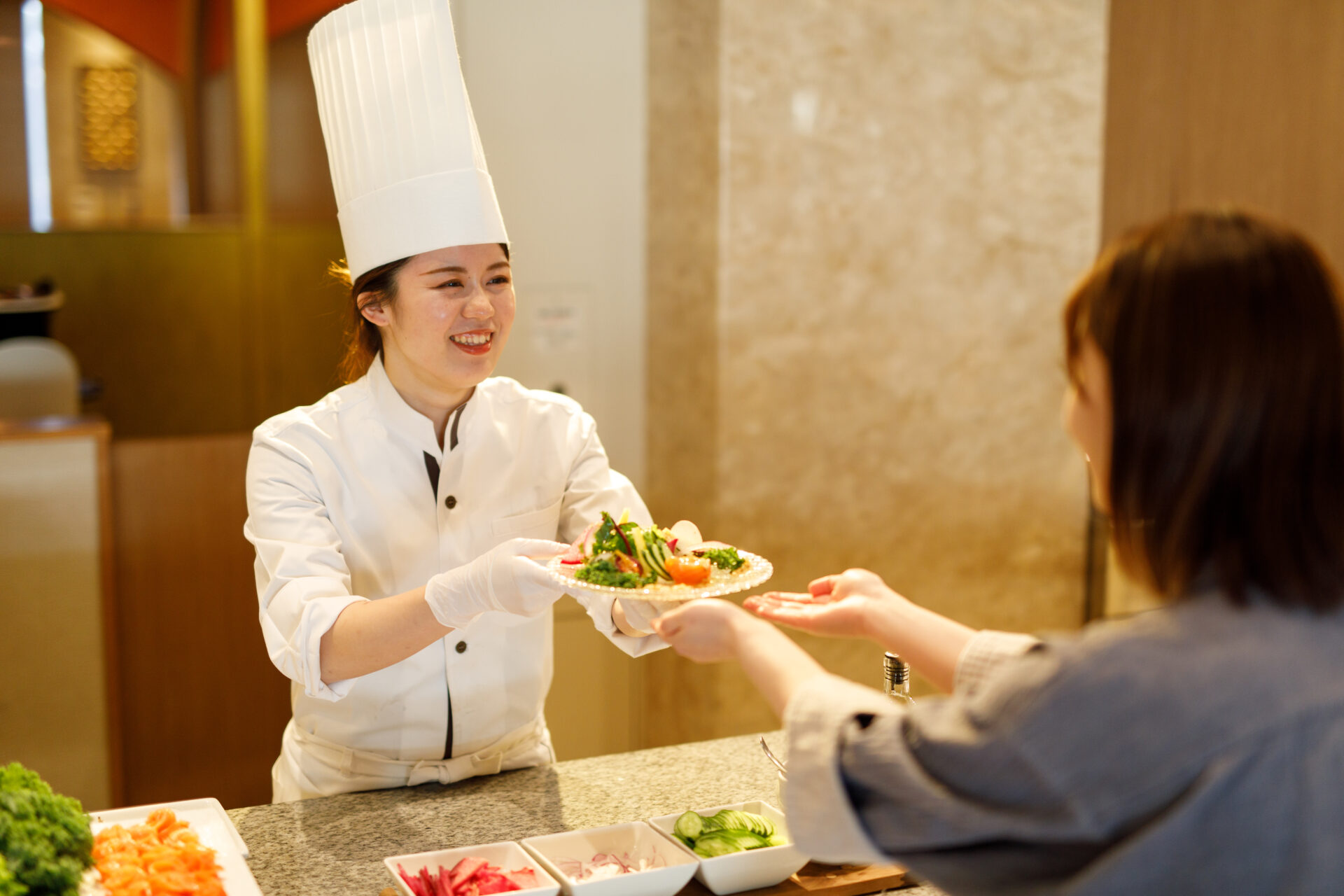 そのひとつが、オープンキッチンでの「オーダービュッフェ」スタイルです。お客様の注文を受けてから調理スタッフがその場で仕上げるこの方式は、「つくりすぎ」を防ぐことができ、従来のビュッフェと比べてフードロスを約36%削減することに成功しました。