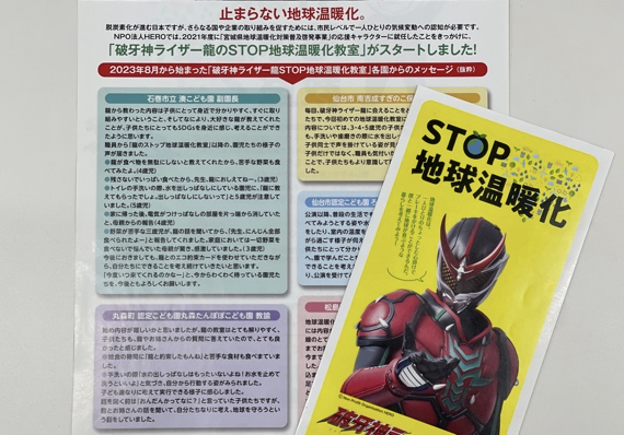 「破牙神ライザー龍(ばきしんらいざーりゅう)」(以下、龍)は、東日本大震災をきっかけに、被災地の子どもたちに希望と笑顔を届けることを目的に誕生したヒーローです。NPO法人HERO(以下、HERO)は、この“龍”を起用し、子どもたちに地球環境への関心を育む「STOP 地球温暖化教室」を展開しています。